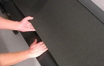 第四步:左右两侧的润滑油加好后,开启跑步机。将跑步机通电运转在3km/h的速度以内,人站上去随着跑步带一起运动,用脚有意识的踏压跑步带下涂有润滑油的区域,使其在跑步板上散布均匀,大约这样维持几分钟运转就可使润滑油被跑带完全吸收啦。